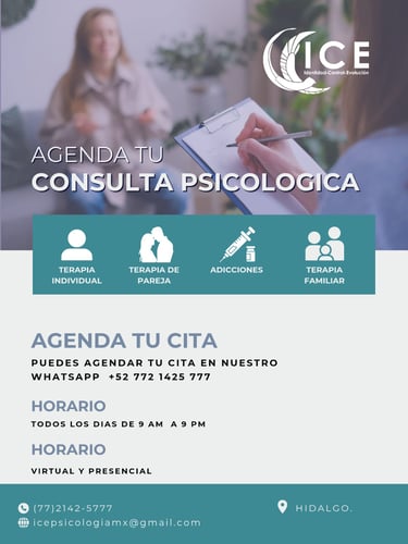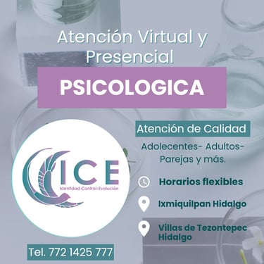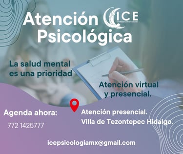 ICE – Psicología es un servicio de atención psicológica enfocado en el bienestar emocional y mental de las personas en diferentes etapas de su vida. Nuestro objetivo es acompañar procesos de autoconocimiento, sanación y crecimiento personal, ofreciendo un espacio seguro donde cada persona pueda expresarse libremente y recibir orientación profesional.